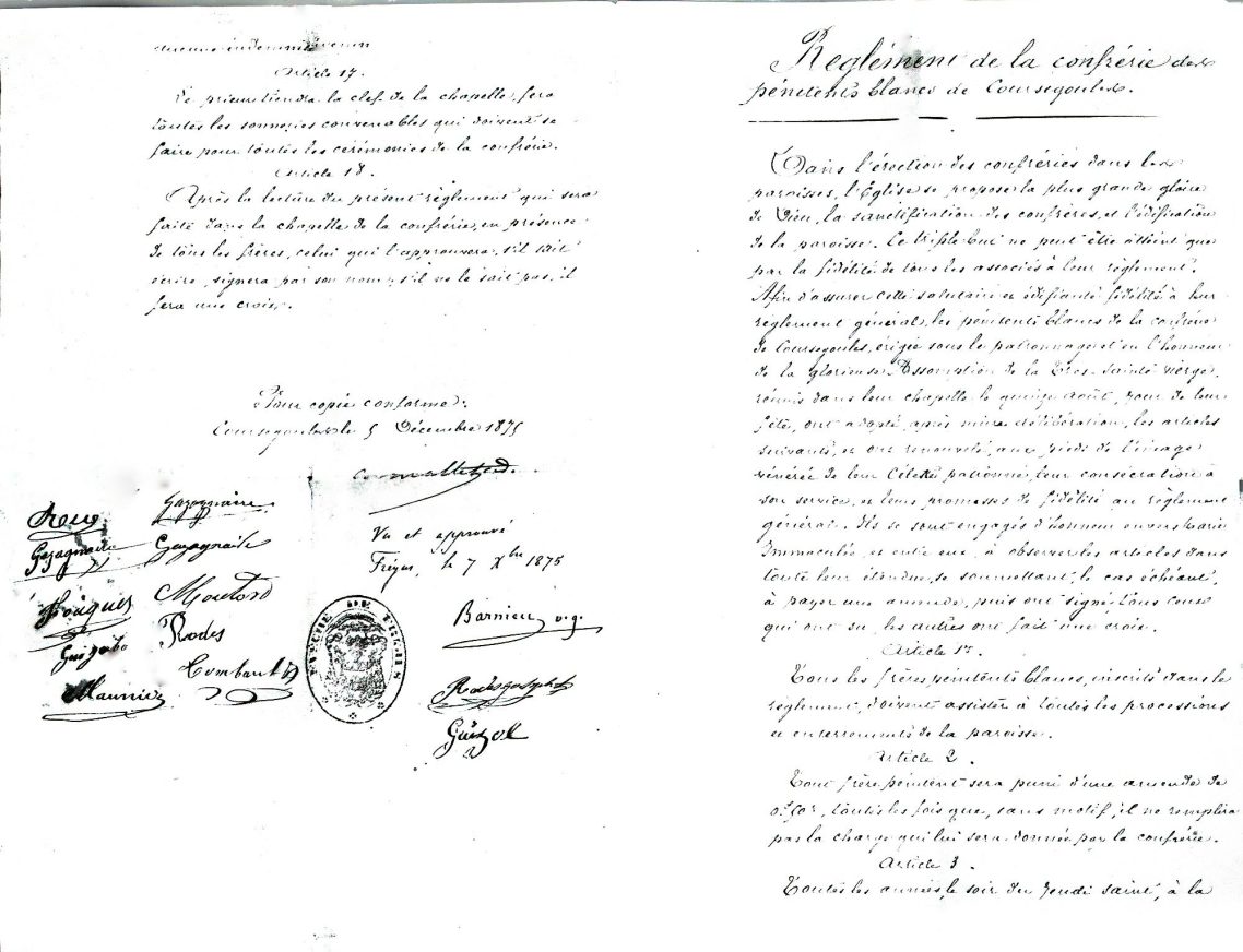 La confrérie des Pénitents blancs de Coursegoules, fondée sous l’égide de l’évêché de Fréjus, jouait un rôle essentiel d’entraide matérielle et spirituelle auprès des plus démunis et organisait la vie communautaire à travers des rituels, un règlement strict et une structure hiérarchisée. Les membres, reconnaissables à leur habit distinctif, étaient élus lors de cérémonies annuelles et devaient remplir diverses charges, participer aux processions et offices. La confrérie s’ouvrit exceptionnellement à une branche féminine au XIXe siècle avant de disparaître au début du XXe siècle.