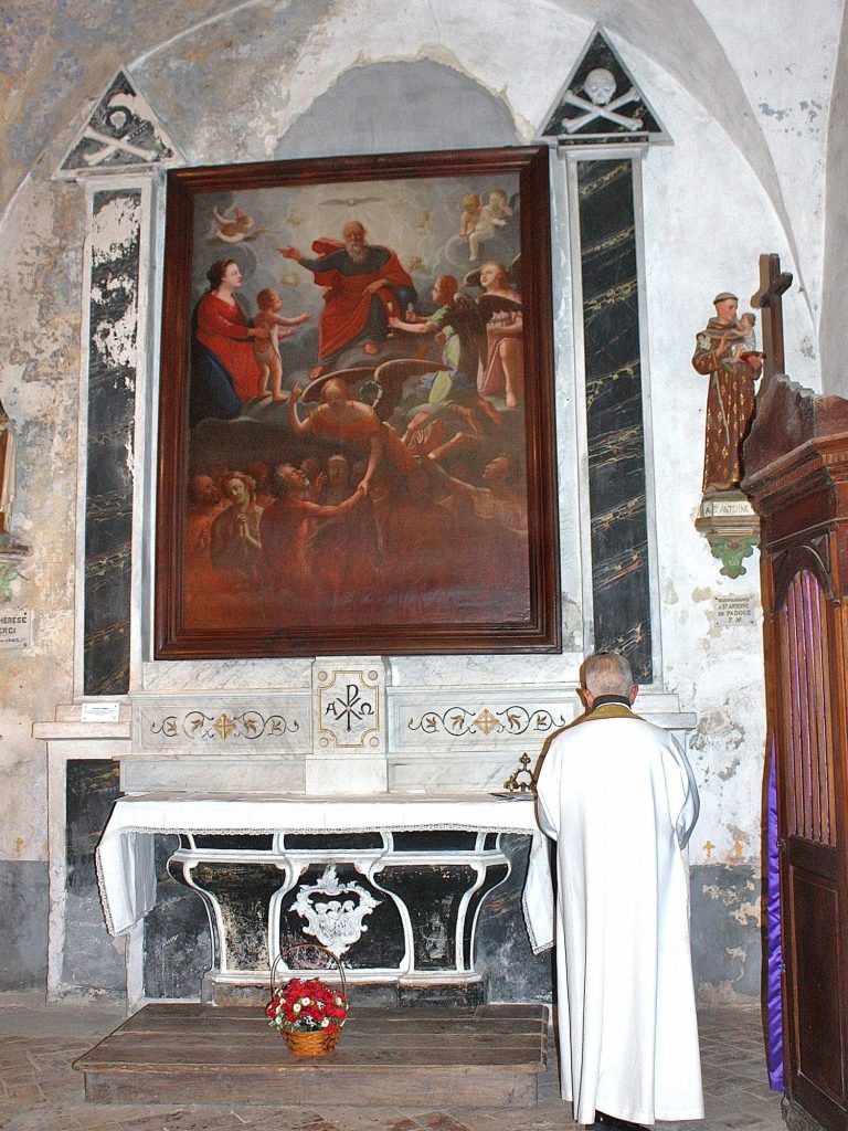 Ce tableau du XVIIIe siècle, s’inscrit dans la tradition baroque provençale et témoigne de l’influence de grands maîtres tels Rubens ou Fragonard. Exposé au-dessus de l’autel latéral sud, il s’agit d’une huile sur toile de grandes dimensions (2,50 m sur 1,90 m), enchâssée dans un retable en stuc, flanqué de deux pilastres surmontés d’un triangle orné d’ossements. Il évoque la mortalité humaine et le passage vers l’au-delà, rappelant aux fidèles la réalité de la condition humaine et la nécessité de la rédemption.