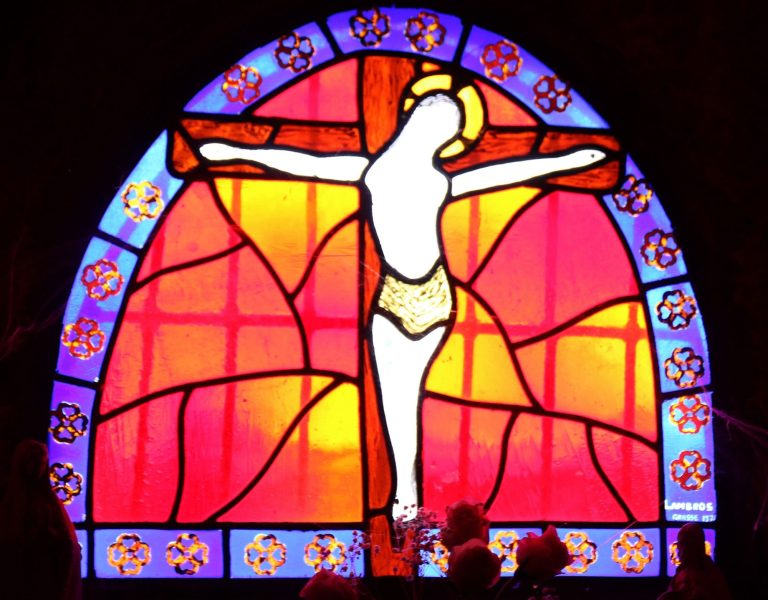 Parmi elles, une femme à la longue chevelure ondulée, en prière, évoque la figure de Marie-Madeleine, symbole de la pénitence et patronne de la paroisse.