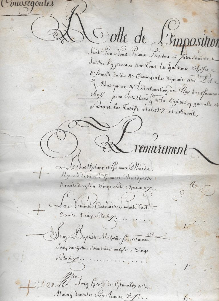 La famille Grimaldi d’Antibes installée au village depuis plusieurs générations et alliée à la famille des Villeneuve quittera le village et l’on effacera jusqu’à sa trace dans les documents communaux malgré qu’Alexandre de Grimaldi ait été un premier consul apprécié et le parrain de nombreux petits Coursegoulois.